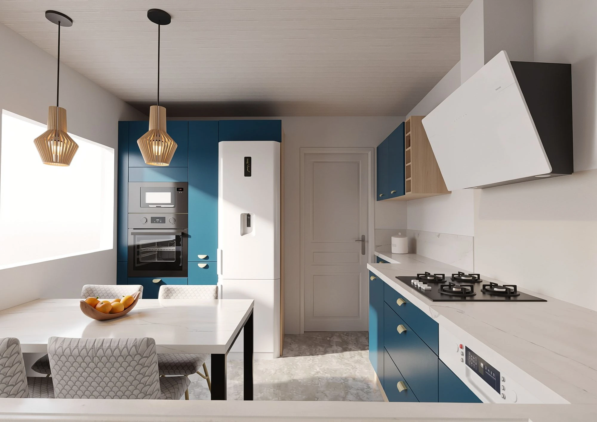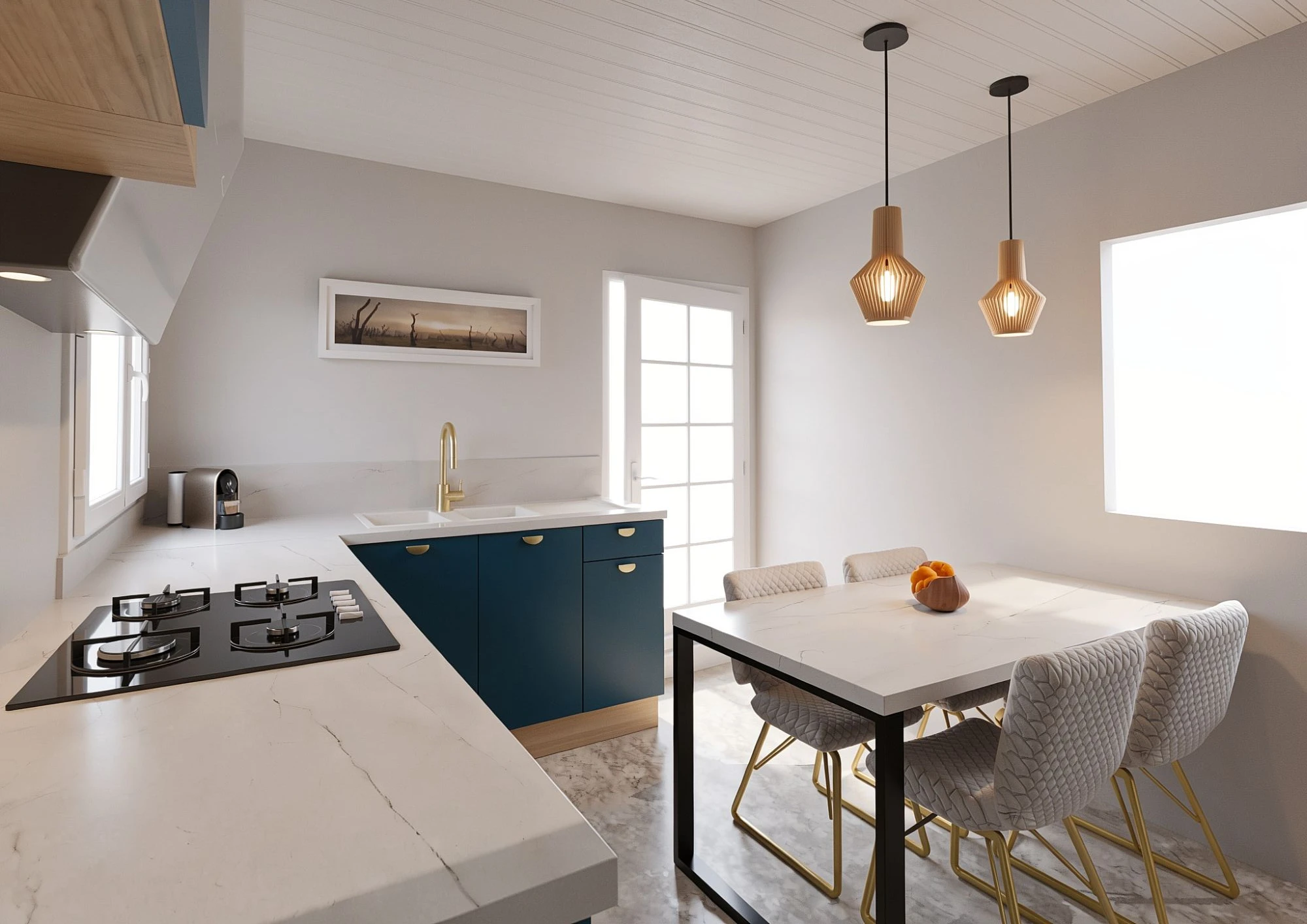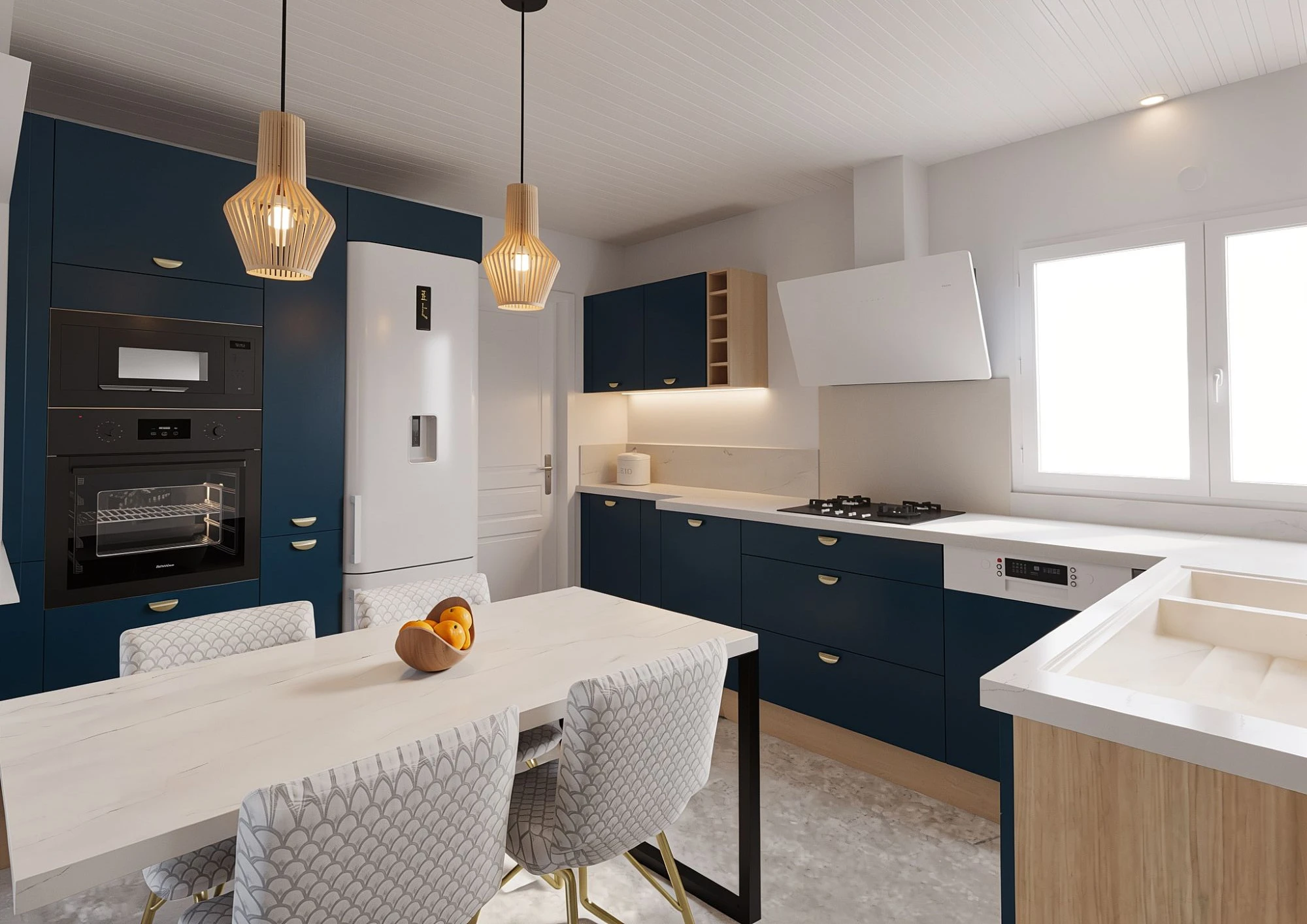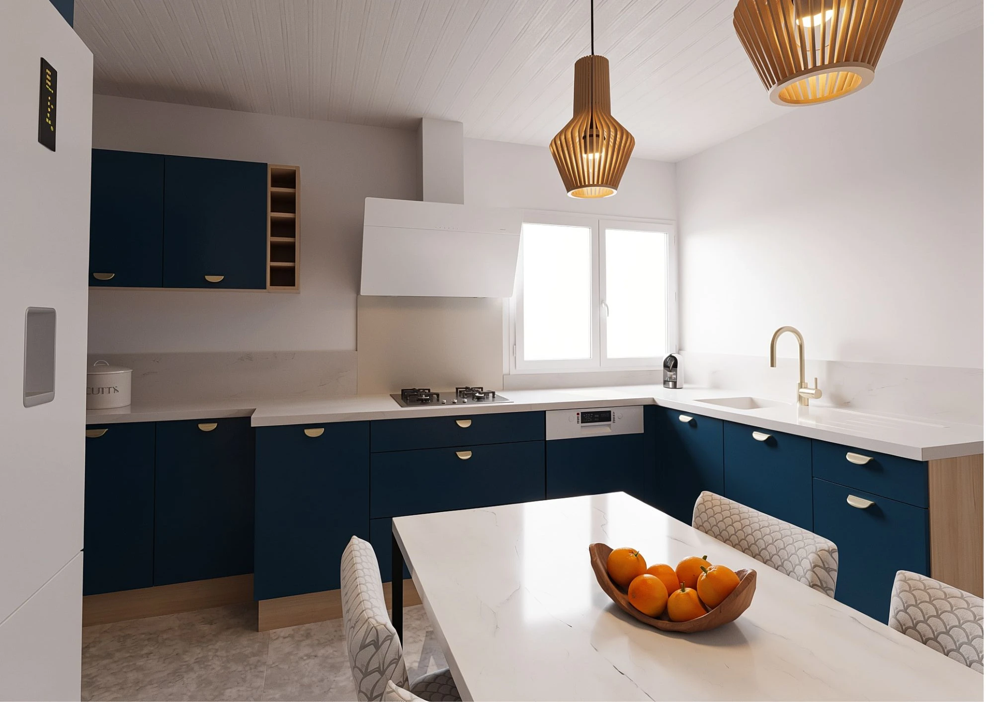 Nous avons conçu un espace lumineux et élégant, mêlant la finition indigo mat de chez YOU à des touches de chêne naturel, apportant du contraste et de la chaleur à l'ensemble. L'implantation optimise les volumes tout en facilitant la circulation et l'utilisation au quotidien.